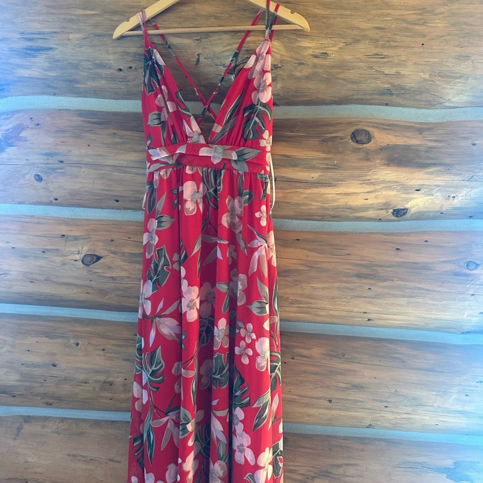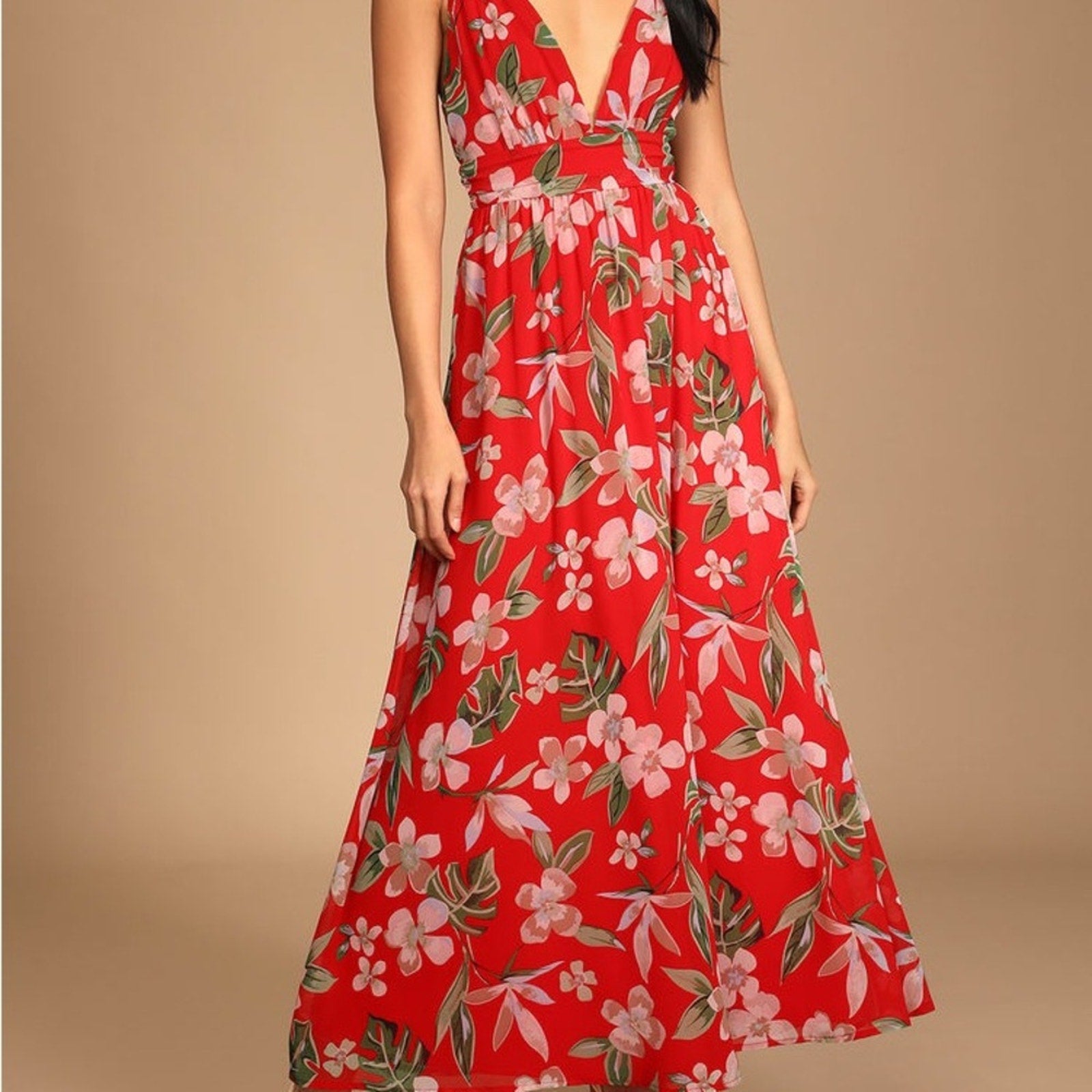 A vacation in the tropics isn't complete until you've taken a stroll with the Lulus Roaming the Riviera Red Tropical Print Sleeveless Maxi Dress! This lovely woven chiffon maxi dress boasts a lively tropical leaf and floral print across its deep V-neckline, gathered triangle bodice, and banded empire waist. Flowy maxi skirt finishes the look. Crisscrossing adjustable spaghetti straps. Hidden back zipper/clasp.