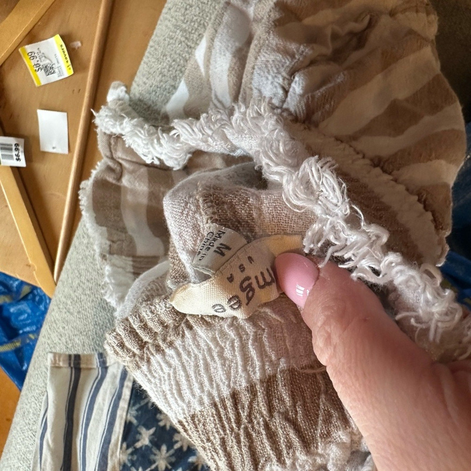 Umgee Women's Striped Linen Blend High Rise Paper Bag Shorts Raw Edge Beige size medium