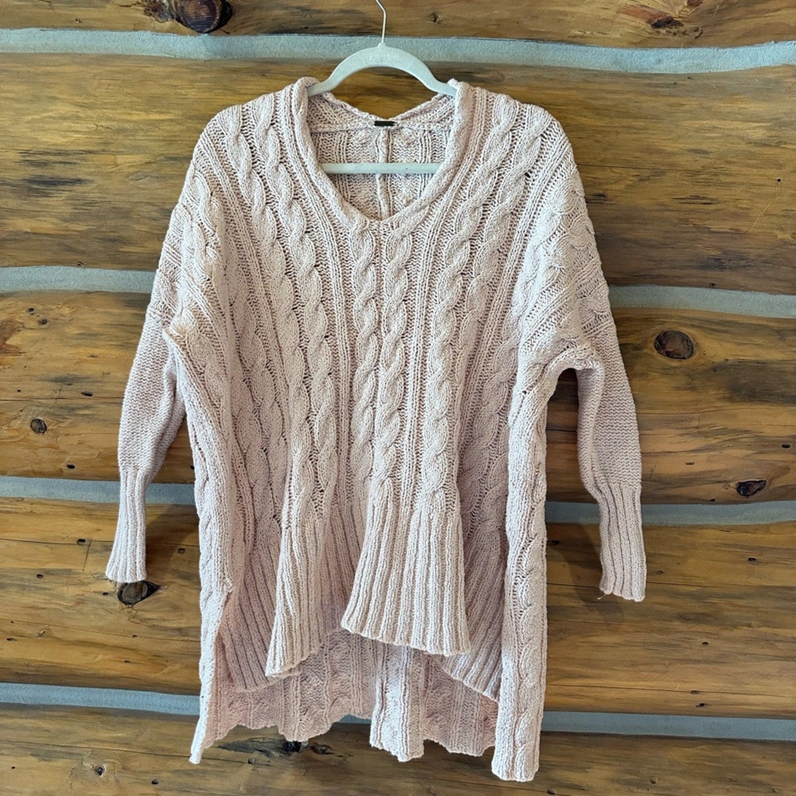 Super soft cable sweater featuring an effortless, oversized fit and a V-neckline. Subtle high low and side vents.