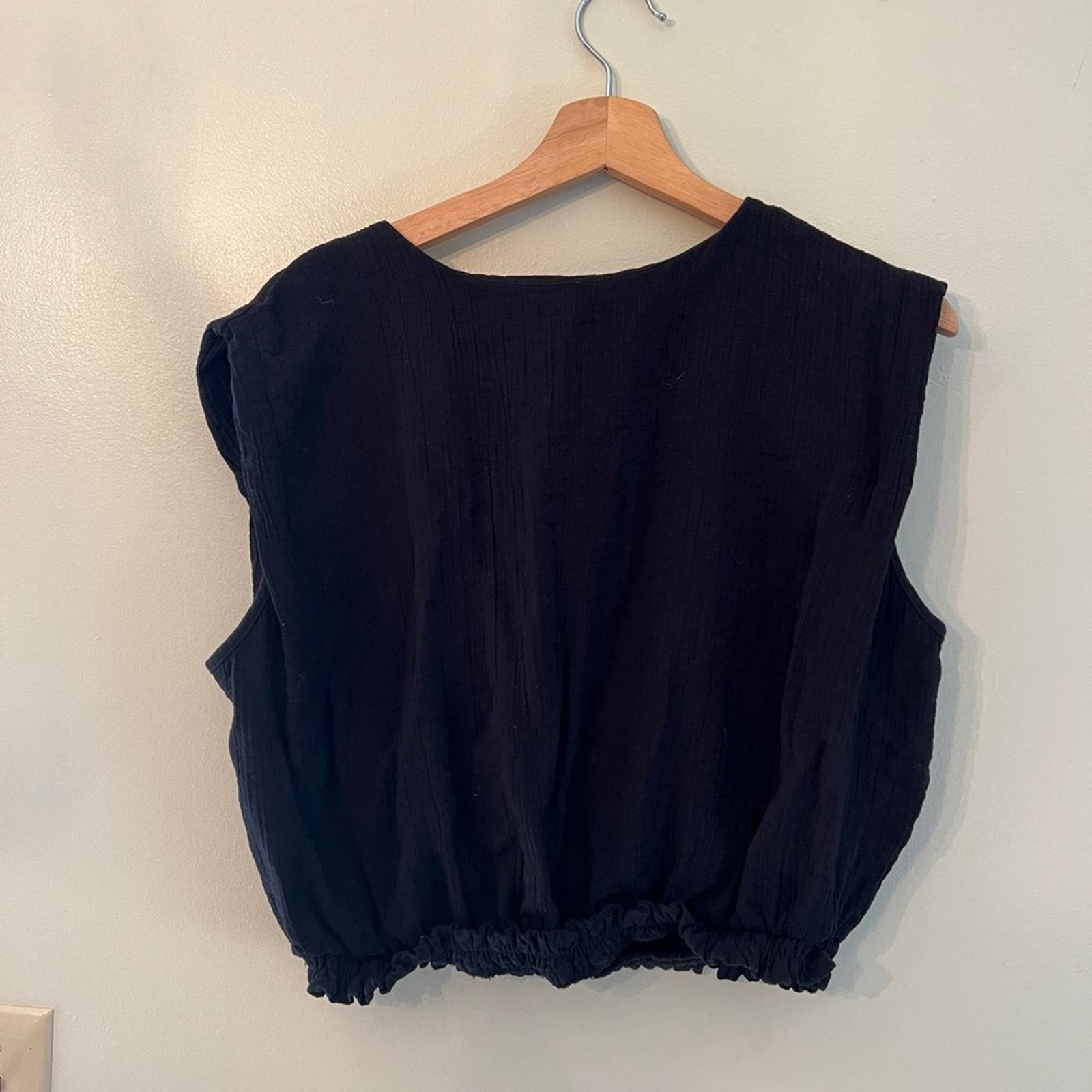 •Gauze tank top in a solid hue •Made of breathable fabric blend •Crew neckline •Extended shoulders •Elastic-cinched waist •Slim-fit silhouette