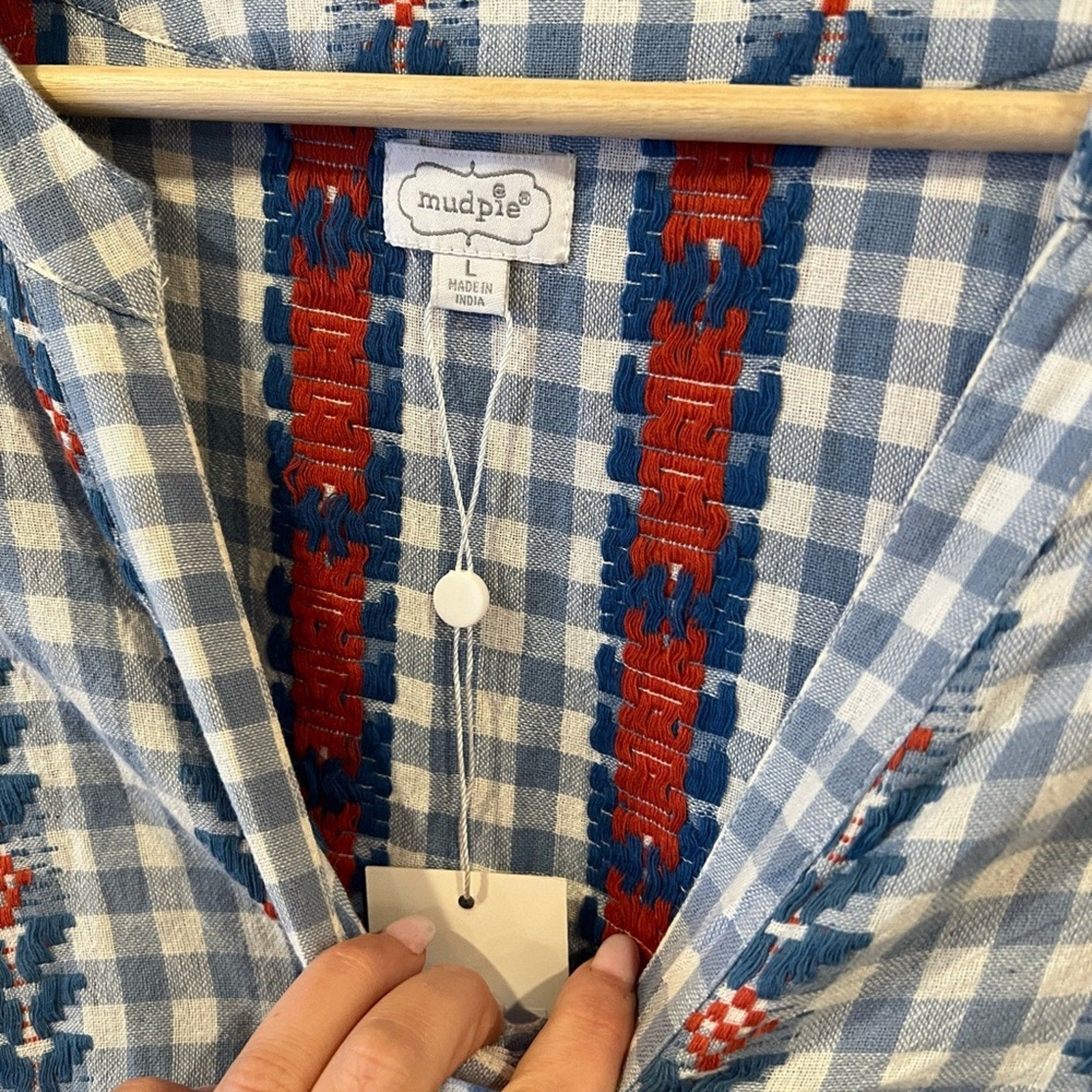 Cotton yarn-dyed dress features custom jacquard pattern, balloon sleeves and tiered bodice.